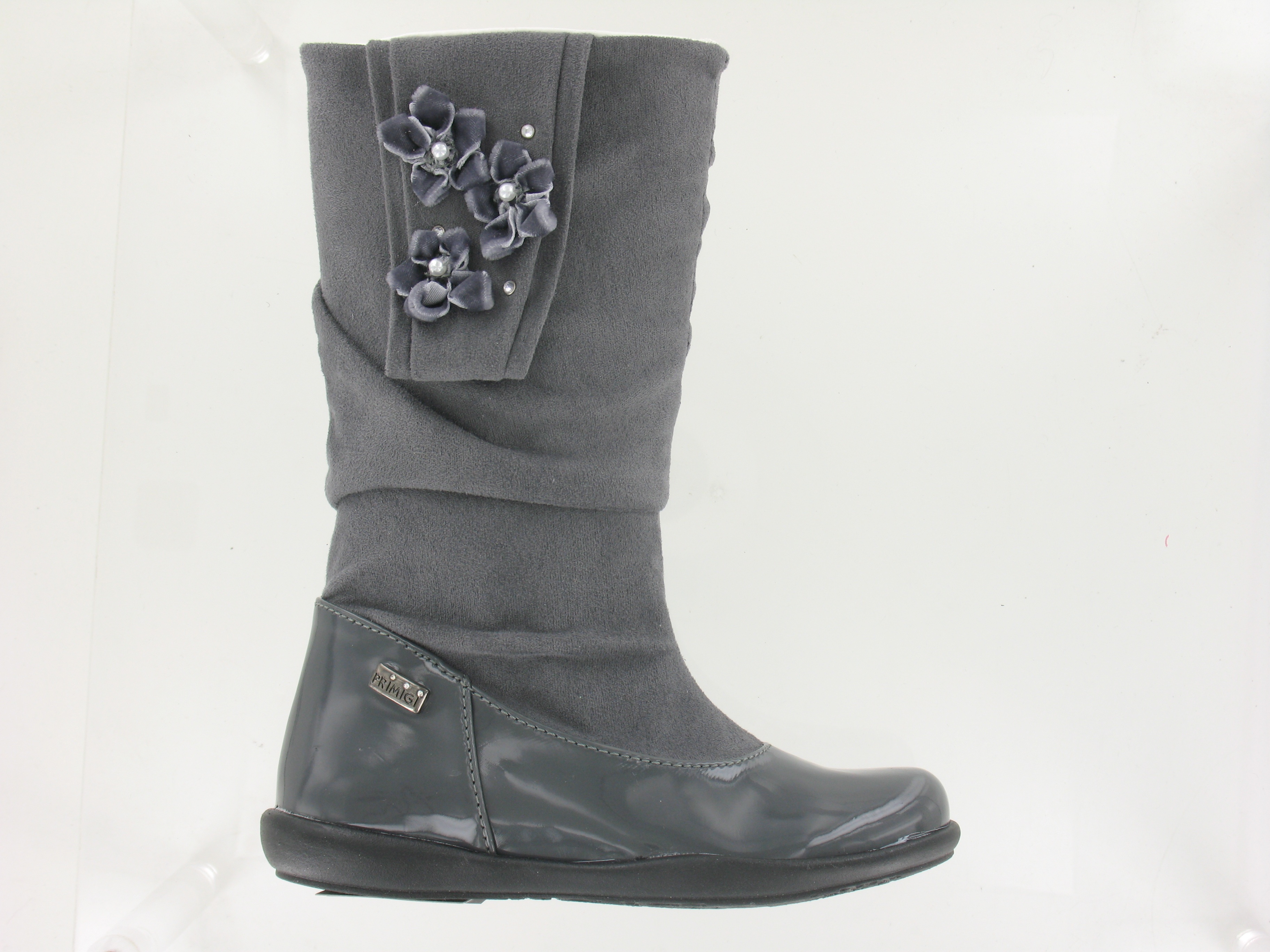 Cizme avand fata din piele patentata (lac elastic), cu rezistenta mare la uzura, zgarieturi, praf si umezeala. Partea de sus este din textil cu aspect de piele scamosata. Captusite cu piele, cu fermoar lateral. Unele din modelele colectiei Primigi urmeaza tendinta inlocuirii pielii naturale - doar la exterior- cu materiale rezistente asemanatoare, din ratiuni de protectie a animalelor.